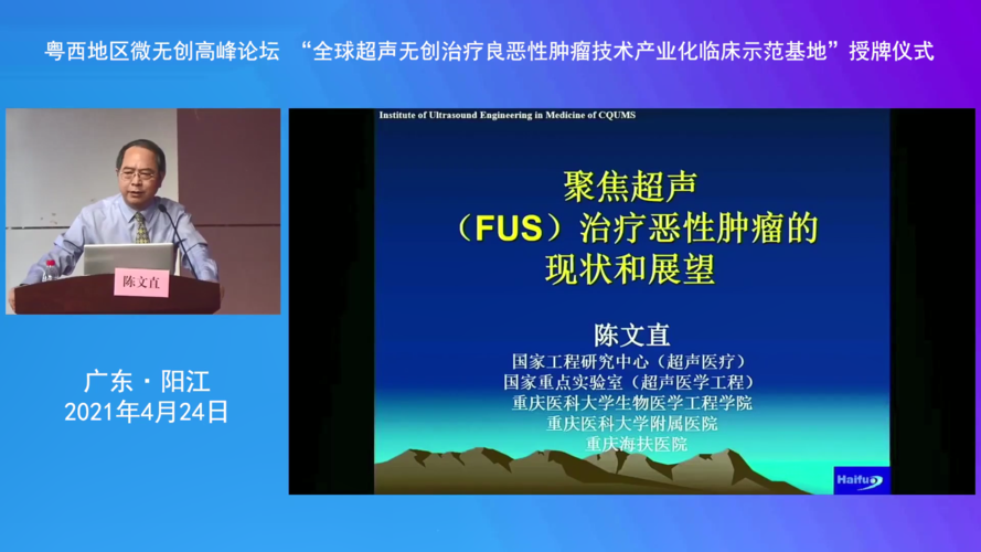 2021年4月24日,粤西地区微无创高峰论坛暨“全球超声无创治疗良恶性肿瘤技术产业化临床示范基地”授牌仪式在阳江市人民医院举行。论坛邀请了超声医疗国家工程研究中心首席医学专家陈文直教授、重庆医科大学李成志教授,以及深圳、佛山等地和阳江及周边地区医院的相关专业专家参加了论坛,阳江市人民医院获授“全球超声无创治疗良恶性肿瘤技术产业化临床示范基地”牌匾。仪式同时举行了有关聚焦超声消融治疗的精彩学术讲座。